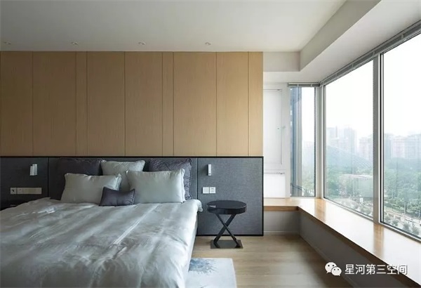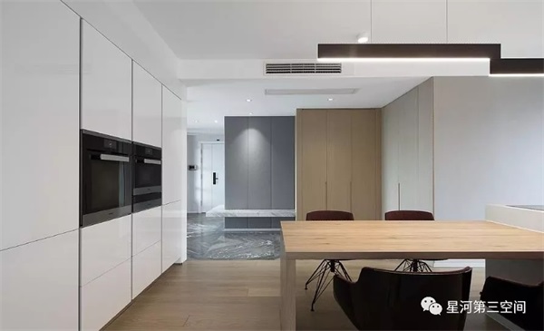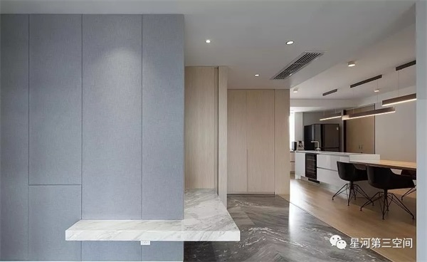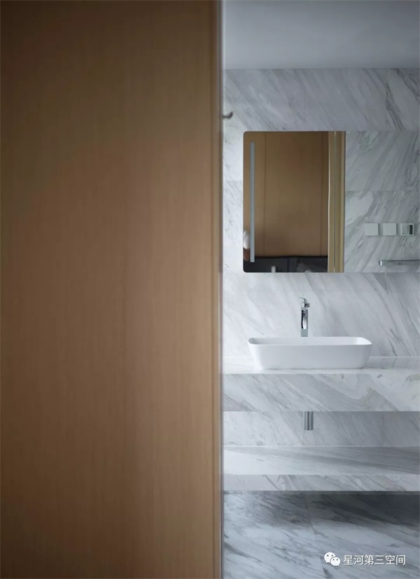 以亲和的木质,柔和灰白系石材的硬朗,纯粹地让人平和,把储藏空间做到“本无”,回到自然本真的写实场景。