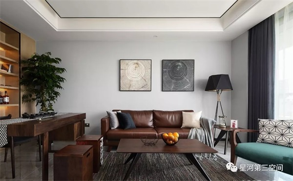 大面积的书柜、偌大的书桌满足了男主人平时看书喝茶的需求,靠墙的咖啡色真皮沙发,接待偶尔来访的客人。
