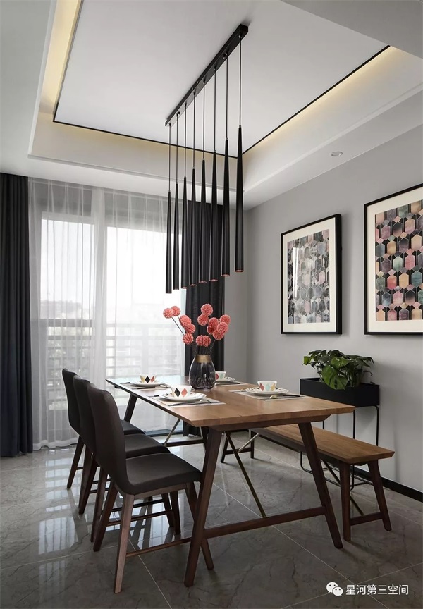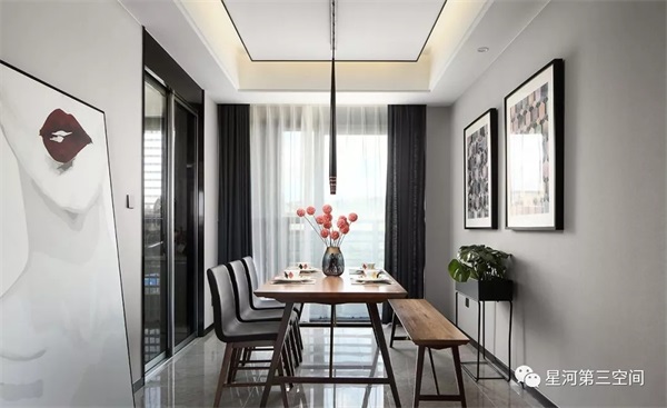 餐厅家具棱角分明,鳞次栉比,线条感清晰,明净而雅致,空间变得更为整洁舒适。