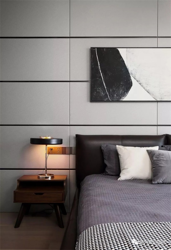 卧室不同色系的柔软色彩恰当好处将冷硬感中和,一柔一刚,一冷一暖,形成一种协调、统一的美感。