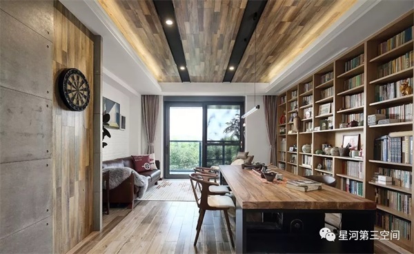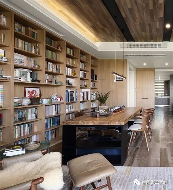 设计师结合户型,做了一个大胆的想法,打破了客厅纯会客的思路,做成了会客兼书房的区域,以书房为主,以会客为辅。