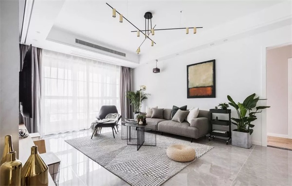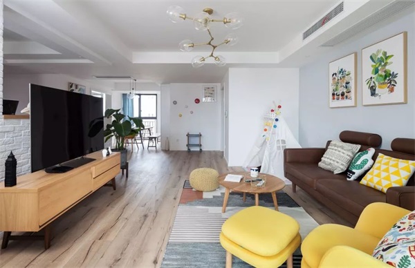 空间风格的客厅以原木色、灰调为主,通过墙面的色彩为白色或者白色调,有时候局部运用色彩是为了达到某种视觉效果
