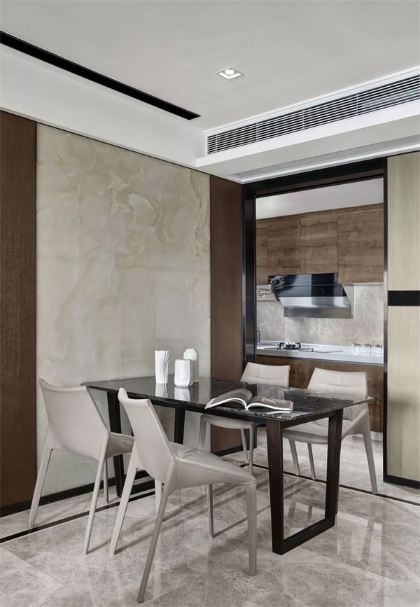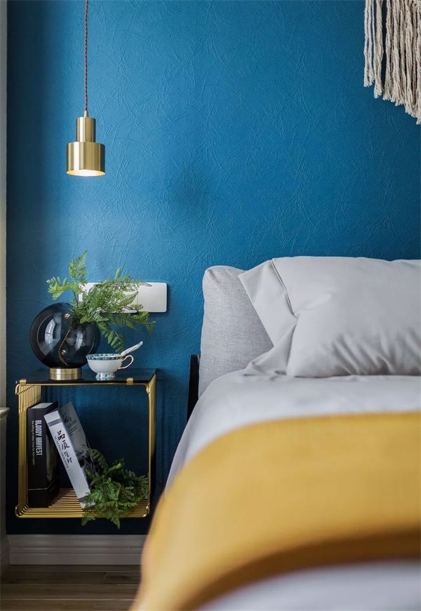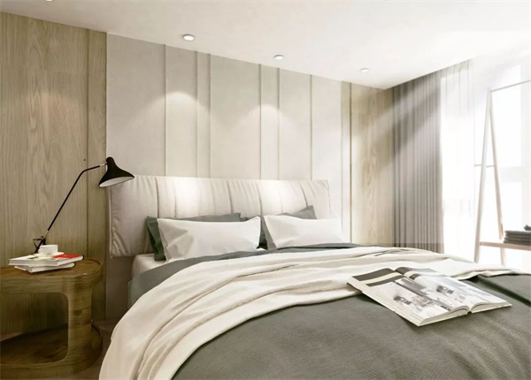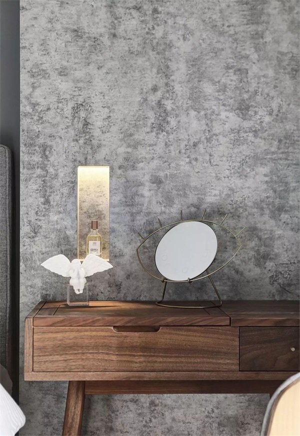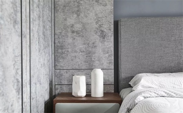 卧室空间舒适干净,以灰调为主,家具的色彩基本为中型或者同色调配色,石材可以让空间丰富起来,有肌理的中性色能够让僵硬的表面柔和起来。
