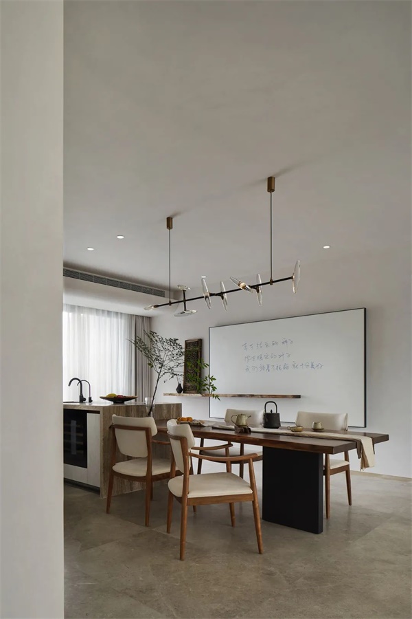 餐厅与西厨岛台连成一体,木质多功能长桌既是品尝人间风味的欢乐场。