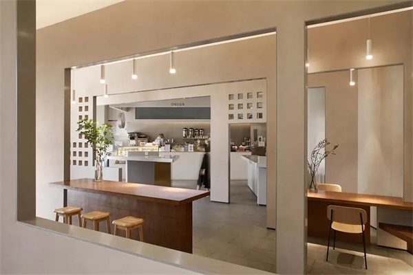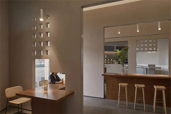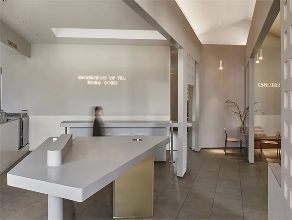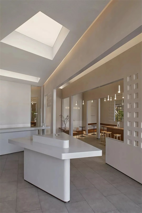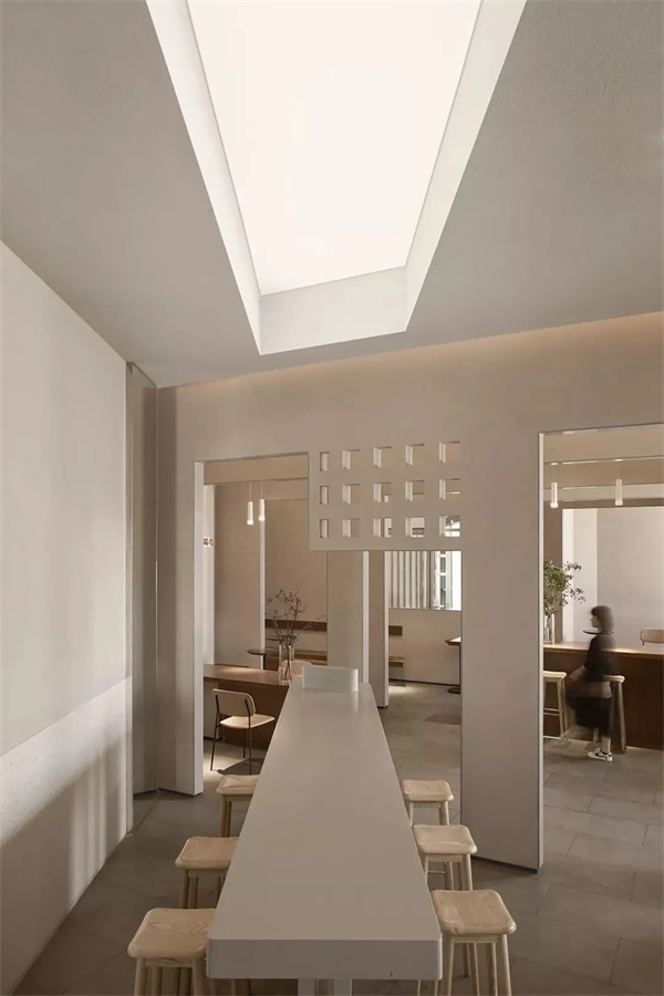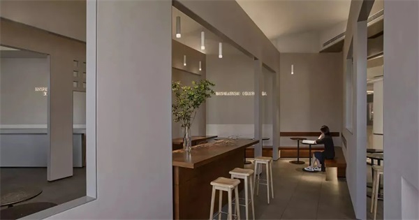 茶空间中,中岛式的自助台和对应的天光是“窄巷”,客流动线由自助台来区分体验空间与娱乐休闲空间。