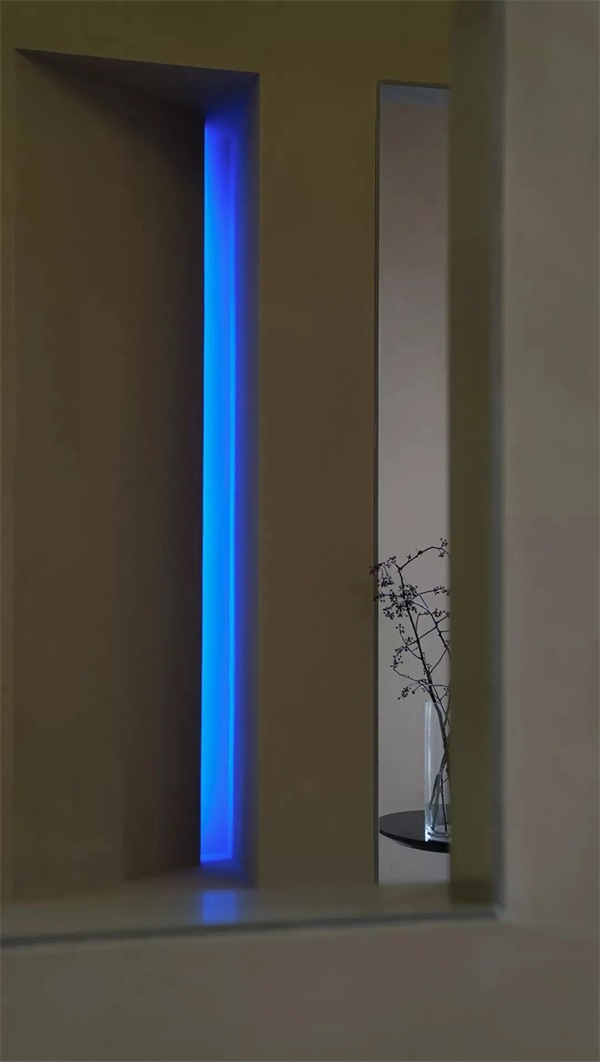 光源照在粗糙材质的斜面天花上形成通高的屋顶,好似巷道中的天光。
