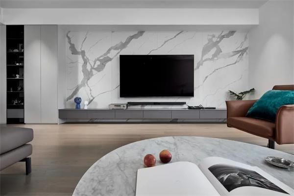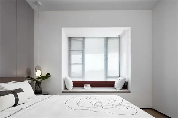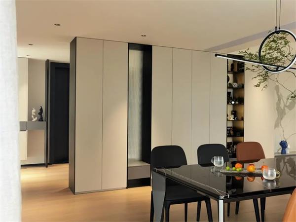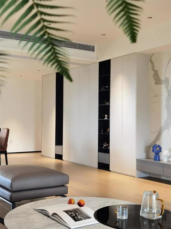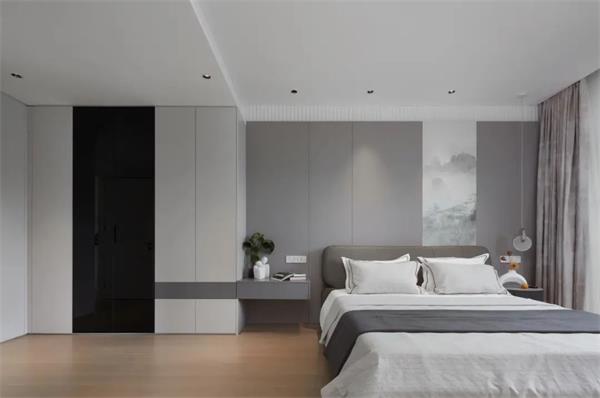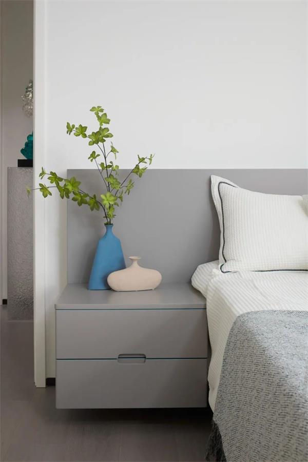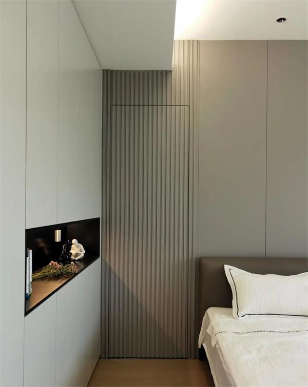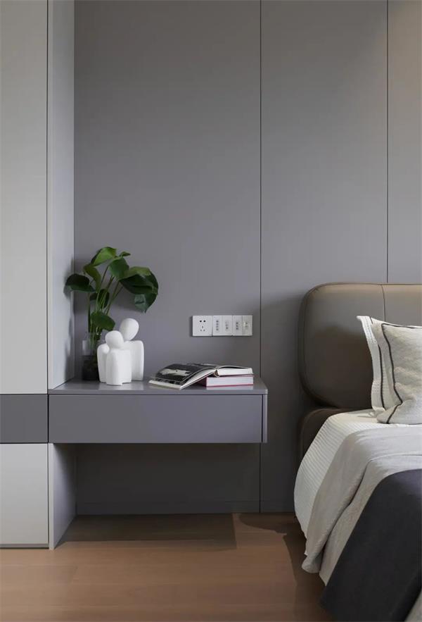 套卫的门藏匿在床头背面,拉长整体的视觉的体验,占用一部分客厅的区域用在衣柜,旁边是收纳浅柜,既最大面积满足了这个房间的收纳功能,同时也让空间整体看起来更加开阔。