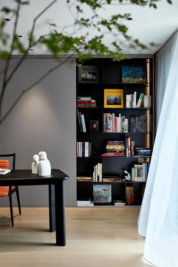 书柜半虚半实,既方便打理,又有一定的展示性。大推拉门的设计,减少线条的繁琐,让书柜整体更干净明朗。开放区展示着主人收藏的各类精品书籍,绘画类、摄影类、文学类......总在想,家里最好的装饰就是主人的底蕴和品位,而书柜就是最直接地表达。