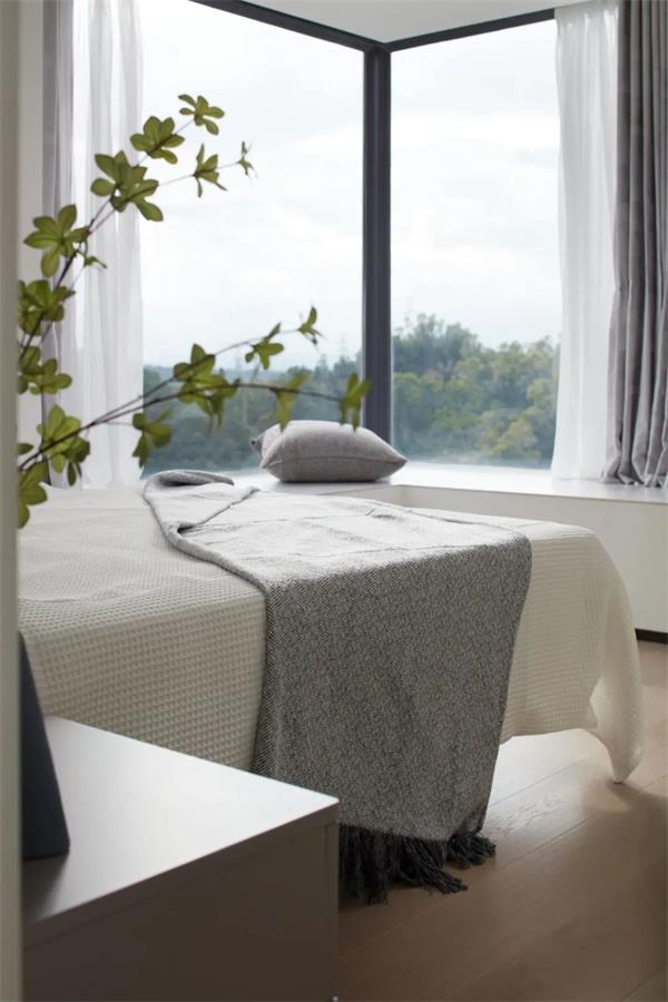 主卧开阔通透,起床便能看见满眼的山景,取一抹山景置于床头,弱化室内外的界限,置身自然里面生长,是最疗愈人的。
